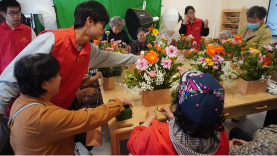 老同志们还参观了居家养老和社区养老实验室。这两个区域精心模拟了老年人日常生活中的各种场景,从家居环境的适老化设计到社区服务的贴心周到,都充分体现了对老年人生活品质的深切关怀与全面提升。参观结束后,大家步入充满创意与活力的双创空间,在这里体验了一场别开生面的插花活动。老同志们巧手摆弄花枝,用五彩斑斓的花朵和生机勃勃的绿叶编织出对生活的热爱与美好向往。一束束精美的插花作品不仅彰显了老同志们独到的艺术审美与心灵手巧,更深深传达了他们乐观向上、积极健康的生活哲学。