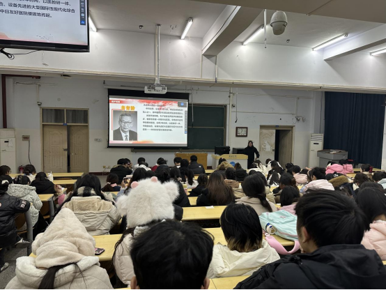 周老师以《西游记》中的“定海神针”为引子,深入浅出地阐述了“定海神针”在政治、文化、军事、经济等领域的象征意义,强调其在维护稳定、促进发展中的关键作用。随后,周老师讲述“医护英雄”,通过多媒体展示和生动的讲解,向同学们介绍了多位医护领域的杰出人物。在这些英雄人物中,有国际知名的护理先驱南丁格尔,有不远万里来到中国参与抗日革命的国际主义战士白求恩,以及我国呼吸疾病研究领域的领军人物钟南山等。他们的事迹无不彰显着医者仁心、大爱无疆的崇高精神,以及为国家和人民健康事业不懈奋斗的坚定信念。